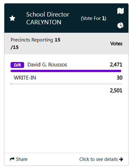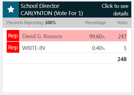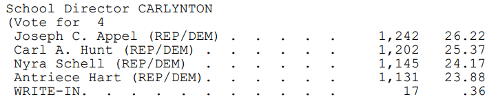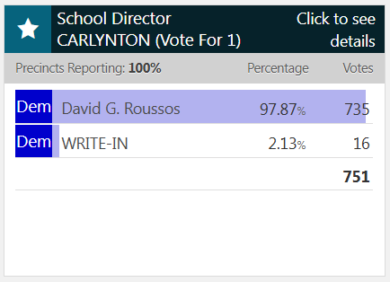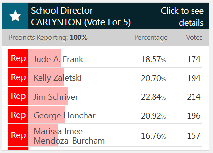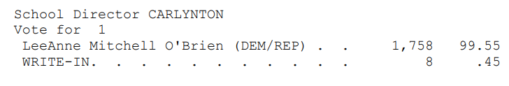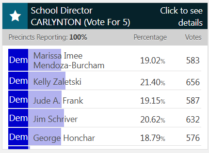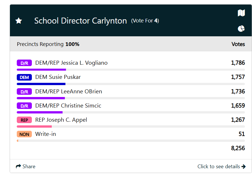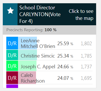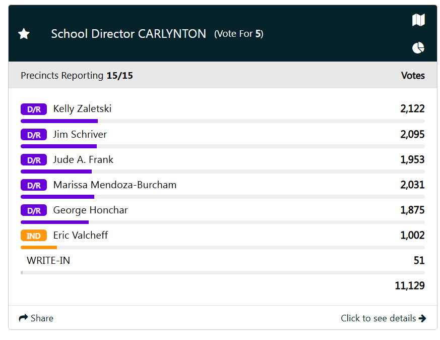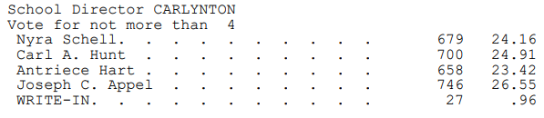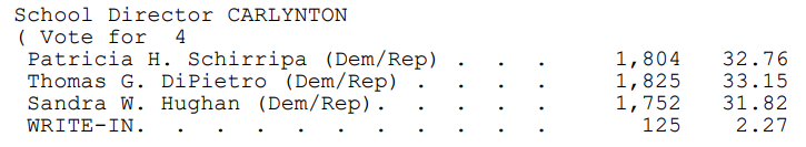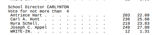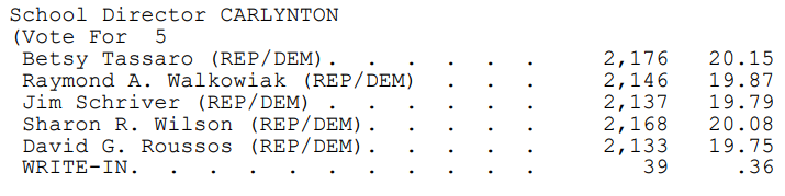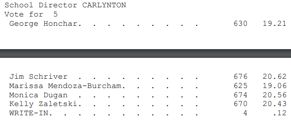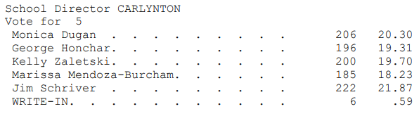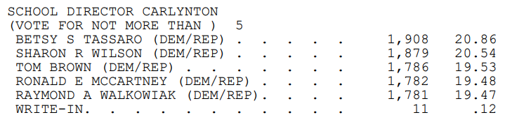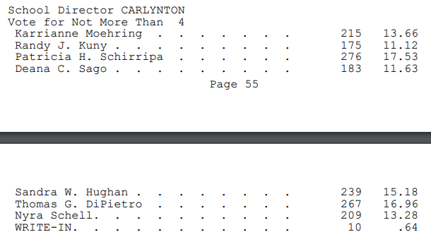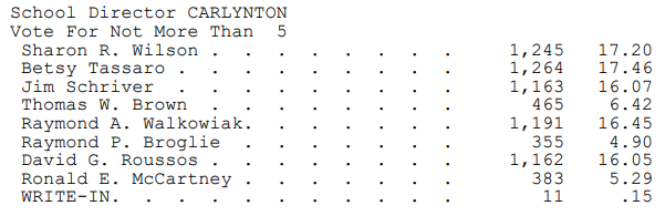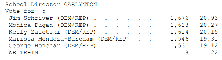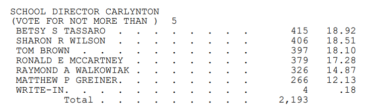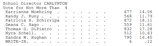 Below are the election results for Carlynton School District going back to 2007, which are the earliest the Allegheny County Elections Division have on their website. All images can be verified at https://www.alleghenycounty.us/Government/Elections/Election-Results